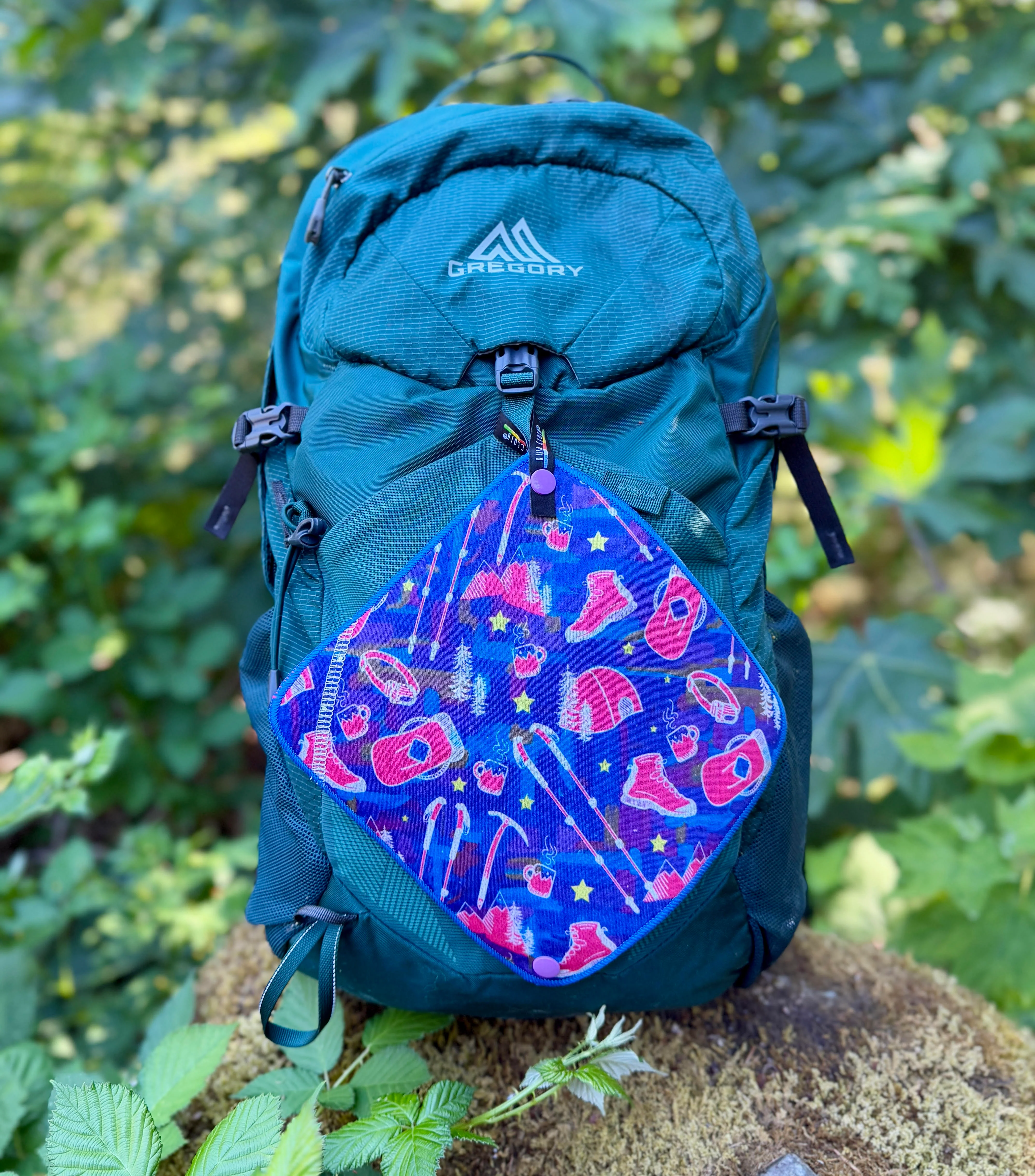 - 'double snap' allows cloth to hang while folded in half (so it doesn't touch pack and/or get dirty on the trail)